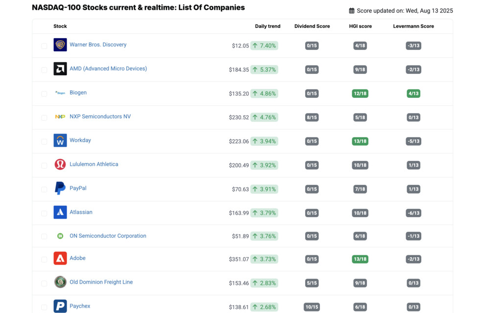 | Stock | Daily trend | Dividend Score | HGI score | Levermann Score |